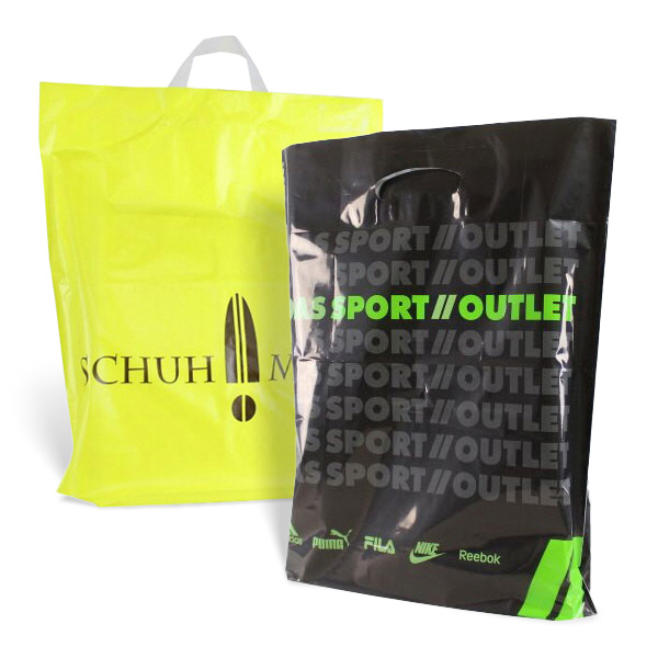 Die klassische Standard-Plastiktragetasche mit ausgestanztem Griffloch führen wir in fünf Größen von 22,5 cm x 30 cm bis hin zu 56 cm x 55 cm und jeweils 10 cm Bodentiefe für ein erhöhtes Volumen. Bei den eleganten Schlaufengrifftaschen mit innen angeschweißten Henkeln hast du die Wahl zwischen drei Formaten. Sie halten auch schweren und voluminösen Lasten stand und eignen sich zum Beispiel für Mode- und Schuhgeschäfte, für Spielwarenshops und Supermärkte.
